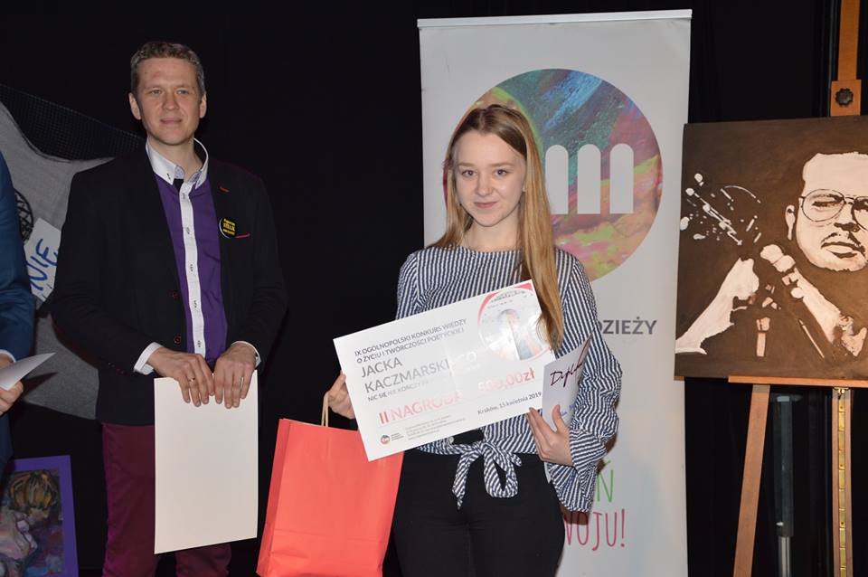 Uczennica klasy III ,,b” liceum Patrycja Ślęzak reprezentowała naszą szkołę w ogólnopolskim konkursie o Jacku Kaczmarskim ,,Nic się nie kończy prostym tak lub nie”. Finałowy etap miał miejsce w Krakowie, do którego przeszły 4 osoby z poprzednich eliminacji. Trzeba było się wykazać zarówno znajomością twórczości Jacka Kaczmarskiego jak i wiedzą o jego życiu. W tym roku nagrodą nie były jedynie książki i dyplomy, lecz również bon pieniężny. Było więc o co walczyć! Patrycja zdobyła II miejsce na podium chociaż wyniki pomiędzy kolejnymi osobami były bardzo wyrównane.
